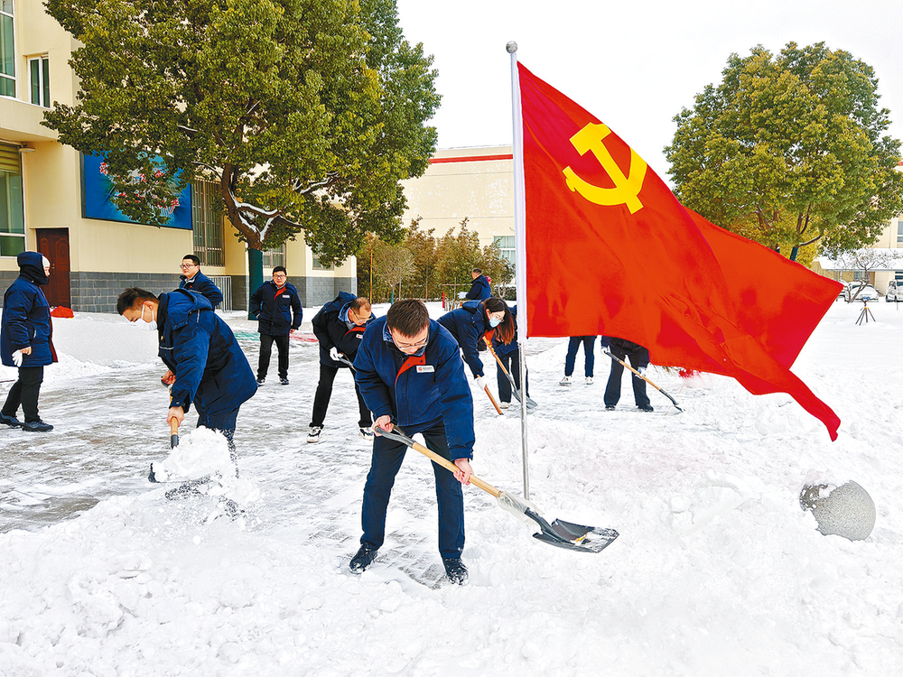 1月19日,豫东地区普降大雪,河南民权公司加大巡检频次,针对重点区域开展拉网式隐患排查,做到隐患早发现、早处理,为能源稳定供应筑牢基础。图为公司党员自发清理厂区道路积雪。本报通讯员 祝寅蓓 摄