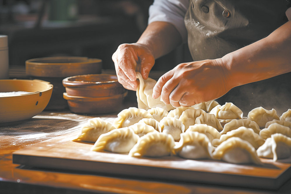 馅是早调好的。竹片挑起一团,不多不少,恰到好处。对折、收拢、一捏、一挤、一推——元宝似的饺子便立在盘中了,肚儿圆鼓,褶子匀密。她包得极快,安静得只有面皮与竹片极轻的摩擦声,和她均匀地呼吸。可那静里,却仿佛有无声的喧腾。面粉、清水、肉与菜,在她的指挥下,完成一场关于团圆与温暖最朴素也最庄重的交响。