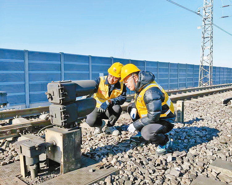 在现场,王东升单膝跪在道砟上,身体前倾,目光紧紧盯住缺口尺,不敢有丝毫偏移。他手持专用扳手,在调节螺丝上均匀施力,每一次转动都以丝米计量。现场跟班作业的组长李晨旭默契配合,通过手持电台与室内联控:“2号道岔请求操反位。”“收到,请注意安全。”随后,道岔在液压与电机驱动下平稳转换,转辙机自动开闭器接点动作清脆利落。王东升再次测量、比对、微调,这样的精细作业,从入职至今,他已重复了无数次。时间在反复调试中悄然流逝。10时30分,经反复测试,2号道岔缺口数据稳定在2.0毫米,各项指标完全达标。王东升这才轻轻舒了一口气,缓缓起身,活动着早已僵硬的膝盖,工具早已被寒气浸得冰凉。天窗作业时间紧迫,容不得片刻停歇,他和工友迅速收拾工具,快步赶往4号道岔作业点。