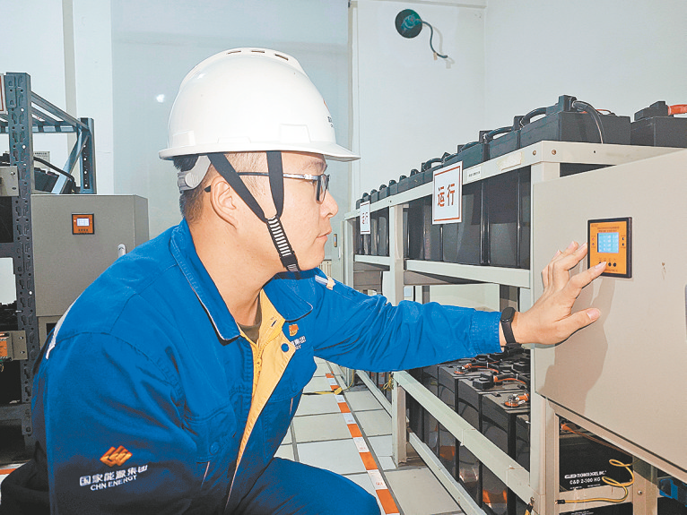 马德瑞在蓄电池室逐一核查每块电池的端电压。
