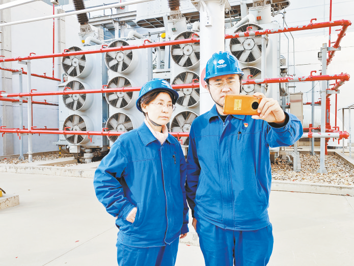 山东泰安公司职工利用巡检工作间隙收看十四届全国人大四次会议开幕会。