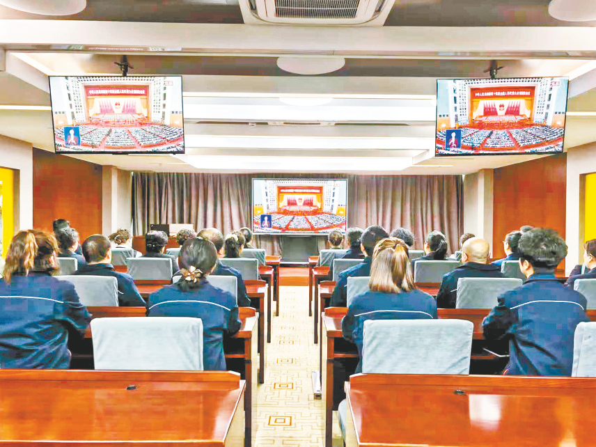 龙源新能源培训中心北方基地教职工集中收看十四届全国人大四次会议开幕会盛况。