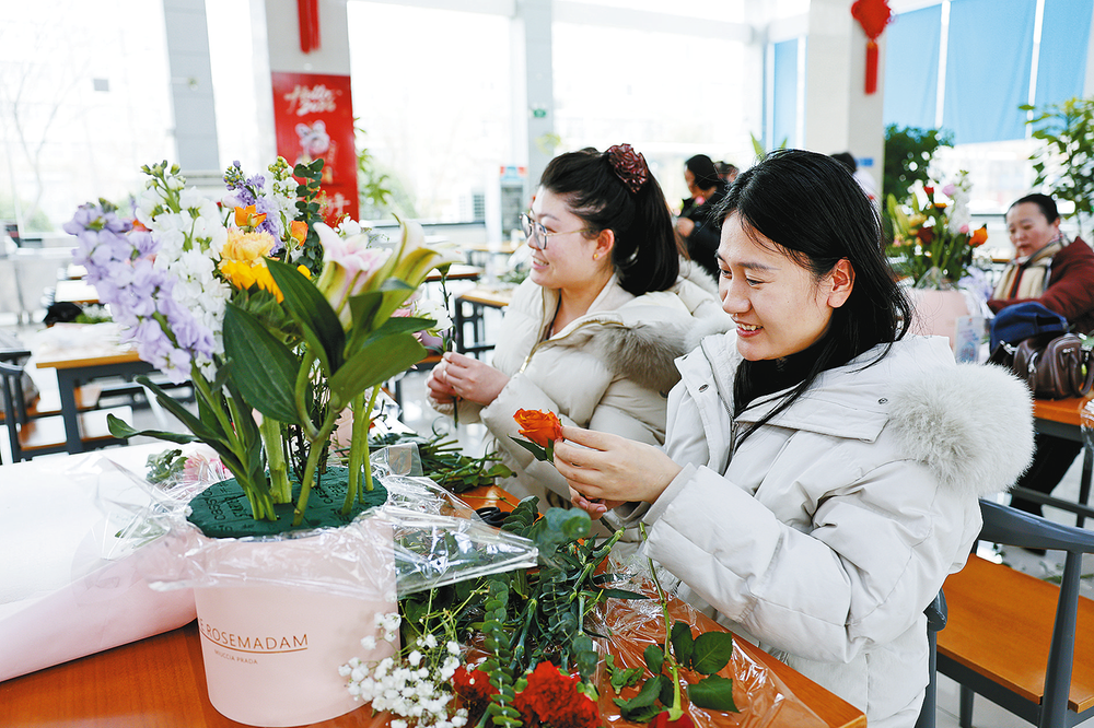 3月6日,铁路装备神维分公司工会开展“花香致敬美丽的她·将美丽进行到底”花艺体验活动,为女职工送上节日祝福与温暖关怀。图为女职工包装花束。 本报通讯员