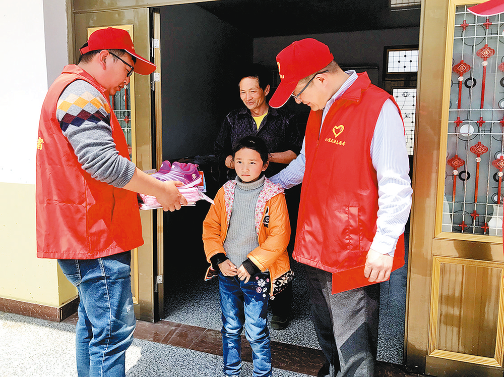 靳健(左)为盱眙县贫困学生送上慰问物资。