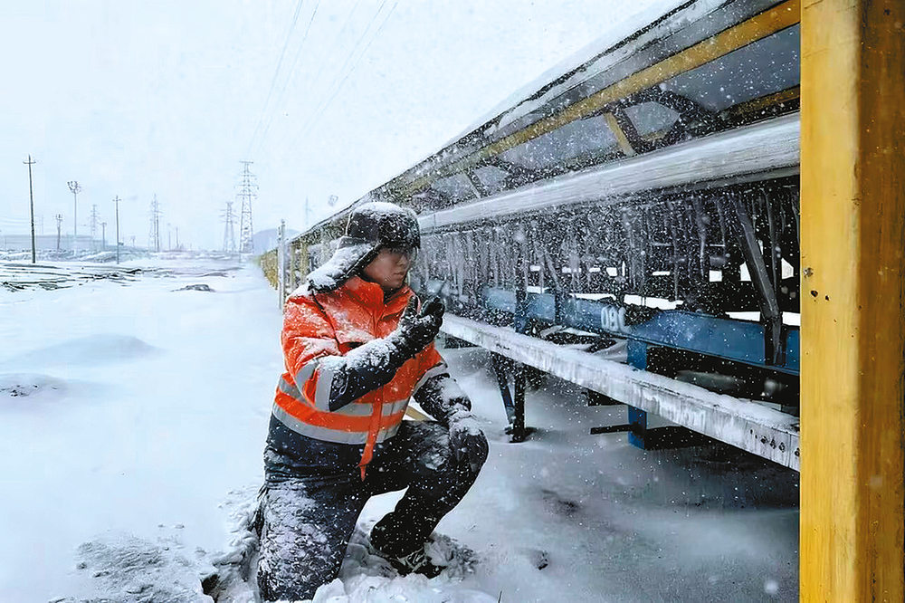 3月13日,雁宝能源储装中心巡检工检查胶带机运行状态。针对近期低温、积雪叠加的复杂天气,该中心加大巡检力度,对关键部位、关键设备开展全覆盖隐患排查,做到隐患早发现、早处置、早消除,夯实安全生产根基。 本报通讯员 胡淇厚 摄