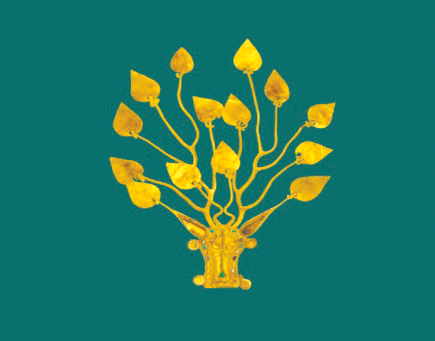 基座似为麋鹿首,眼、眉、鼻及枝杈上镶嵌有白、绿、蓝色料石,眉梢上端另加一对圆圈纹。上面似鹿角,为三条主干并分杈,杈梢上缀桃形金叶。耳、面和主干上焊金珠,并在分叉处掐丝镶嵌绿松石等料石。这种冠饰当头部摇动时,叶片随之颤动,发出金属般的声音。
