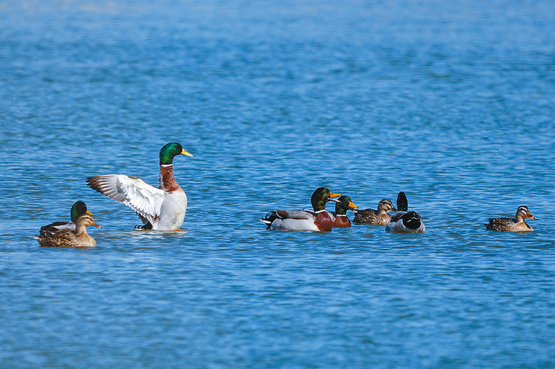 澄澈的湖面漾着细微波纹,绿头鸭扇动白羽抖落一身水珠,身旁的同伴悠然游弋,有的低头梳理羽毛,有的静静侧耳聆听。