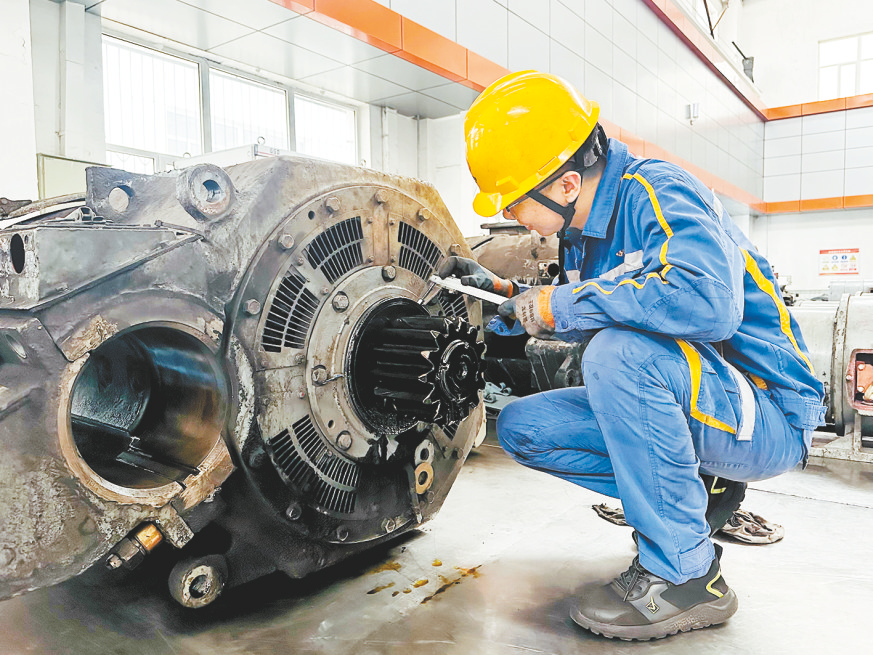 为保障设备安全运行,包神铁路机务分公司开展机车电机隐患整治工作,重点对修程期各类型机车电机等关键部位进行排查,坚持“边检查边整修”,保障机车安全稳定运行。图为4月16日,巡检人员检查机车电机油封状态。
