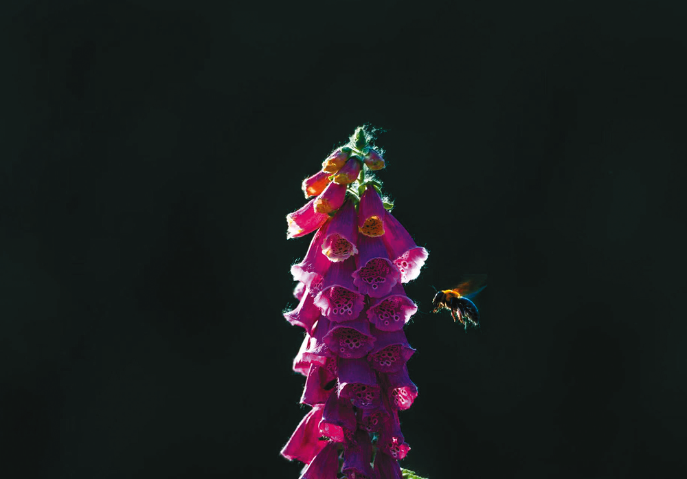 深紫色钟形的毛地黄串串垂挂,细密绒毛上凝着春日微光。蜂儿振翅飞来,黑黄相间的身影裹挟着清风,在浓绿底色的映衬下,将春日里生命的奔赴与自然的默契,定格成一曲灵动的交响。